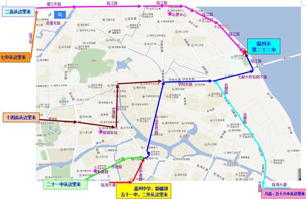 5、温州十四高:→过境公路→锦绣路→宏源路→学院东路→七都大桥下左拐→瓯江路→终点(二十二中)